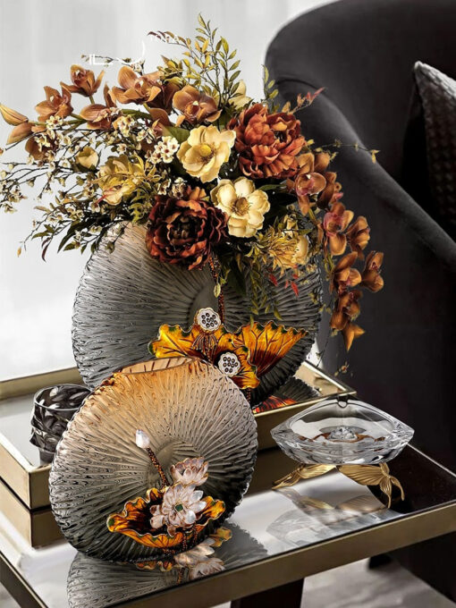 Lọ hoa phong cách châu Âu mang thiết kế tinh tế với họa tiết hoa sen và lá nổi bật, kết hợp chất liệu thủy tinh cao cấp tạo nên vẻ đẹp sang trọng và cổ điển. Sản phẩm thích hợp làm điểm nhấn trang trí cho phòng khách, phòng ngủ hay bàn làm việc, giúp không gian thêm phần quý phái và đẳng cấp.