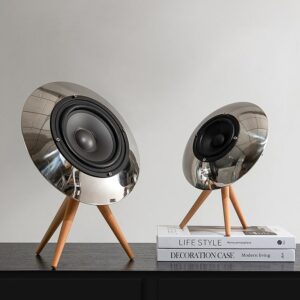 Loa được làm từ kim loại bền chắc, có khả năng chống va đập và oxy hóa tốt, kết hợp với chân đế gỗ tự nhiên được gia công kỹ càng giúp tăng tính ổn định và thẩm mỹ cho sản phẩm. Chất liệu cao cấp không chỉ đảm bảo tuổi thọ sản phẩm mà còn nâng cao giá trị trang trí cho không gian.