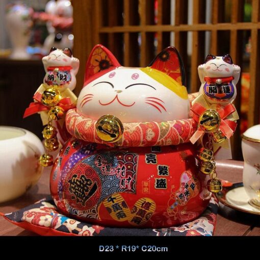 Màu đỏ trên thân mèo thần tài được phối hợp hài hòa với các chi tiết vàng, đen và trắng, tạo nên một tổng thể vừa nổi bật vừa trang nhã. Đây là màu sắc lý tưởng để kích hoạt vượng khí, đặc biệt phù hợp với các dịp khai trương, lễ tết hoặc trong không gian kinh doanh.