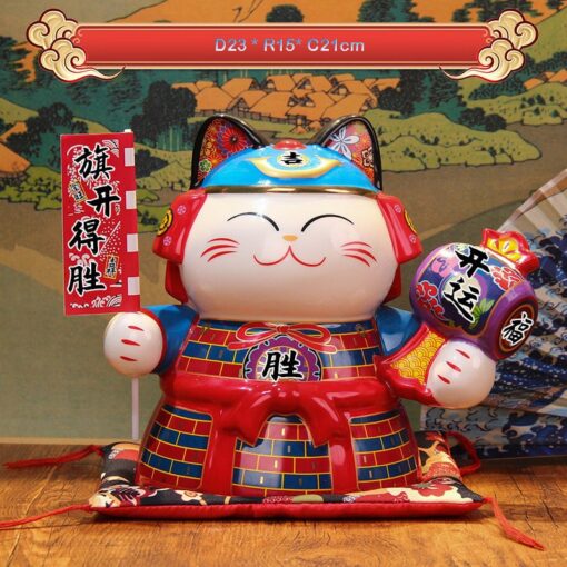 - Mèo Samurai lớn: Kích thước D32 * R22 * C26cm, phù hợp bày tại phòng khách, quầy thu ngân hoặc lối vào cửa hàng để chiêu tài, đón lộc.