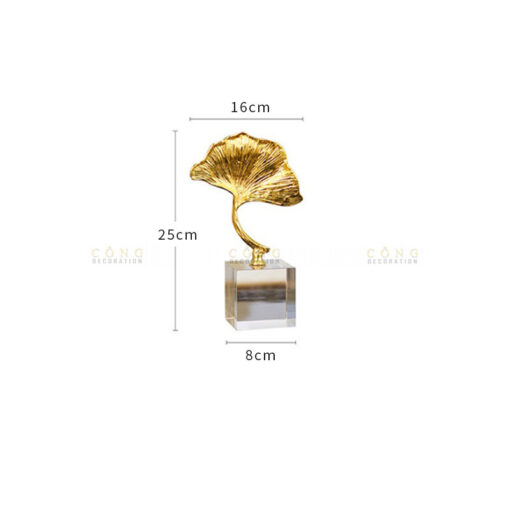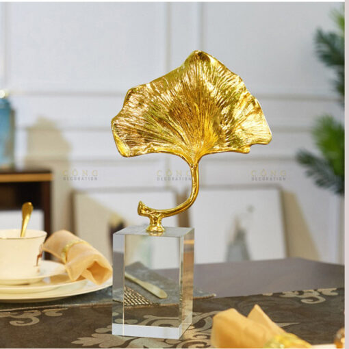 Tượng lá bạch quả vàng được chế tác từ đồng cao cấp, kết hợp với lớp phủ vàng sáng bóng. Phần đế tượng làm bằng chất liệu pha lê trong suốt, tạo nên vẻ đẹp hiện đại và sang trọng. Nhờ sử dụng những chất liệu đồng cao cấp, sản phẩm không chỉ bền bỉ mà còn giữ được vẻ đẹp lâu dài qua thời gian.