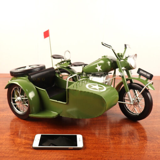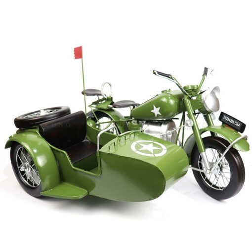 Mô hình sidecar phong cách vintage được thiết kế với các chi tiết rất tinh xảo, từ bánh xe, tay lái, cho đến các bộ phận khác của sidecar. Màu sắc của sản phẩm mang đậm hơi thở cổ điển, với sự kết hợp của các tông màu đậm, nổi bật như xanh quân đội, vàng nâu, và các chi tiết kim loại sáng bóng. Đây là những yếu tố giúp mô hình này mang lại vẻ đẹp vintage độc đáo, phù hợp với những ai yêu thích sự hoài cổ và tinh tế.