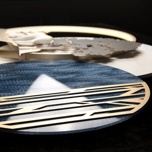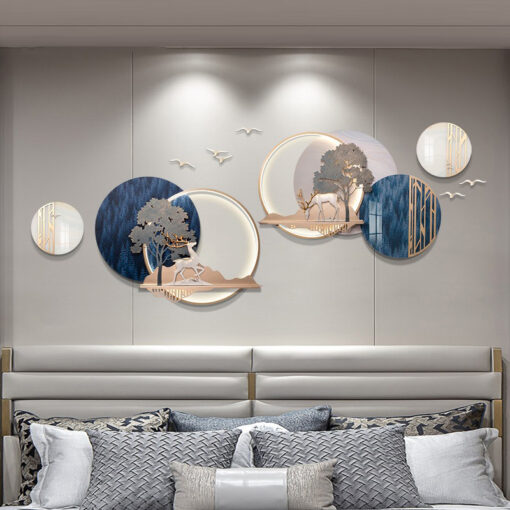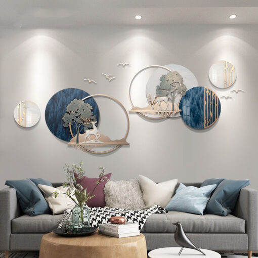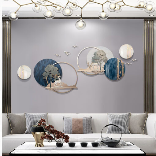 Bức phù điêu này được thiết kế với hình ảnh hươu nai hòa mình vào thiên nhiên, cây cối và những đám mây trắng. Những chi tiết này được làm nổi bật nhờ vào sự kết hợp khéo léo giữa các hình tròn Acrylic và các yếu tố kim loại vàng nhẹ nhàng. Thiết kế mang lại sự cân đối, hài hòa cho không gian, đồng thời tạo điểm nhấn nghệ thuật đầy ấn tượng cho phòng khách.