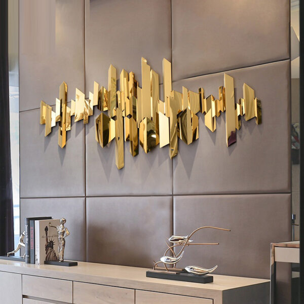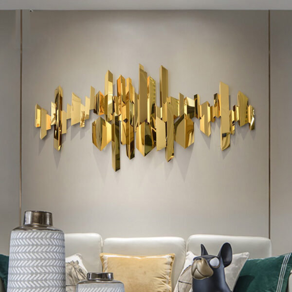 Tranh sắt treo tường phòng khách có tính linh hoạt cao, dễ dàng phối hợp với các phong cách nội thất khác nhau. Dù phòng khách của bạn theo phong cách hiện đại, tối giản, hay cổ điển, phù điêu ánh vàng kiến trúc hiện đại đều có thể hòa hợp và làm tôn lên vẻ đẹp của không gian. Những chi tiết kim loại sáng bóng tạo ra sự tương phản ấn tượng, đồng thời mang lại cảm giác hiện đại và sang trọng.