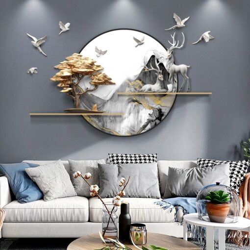 Phù điêu treo tường hươu và núi mang phong cách hiện đại