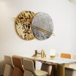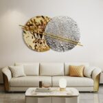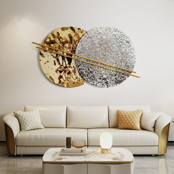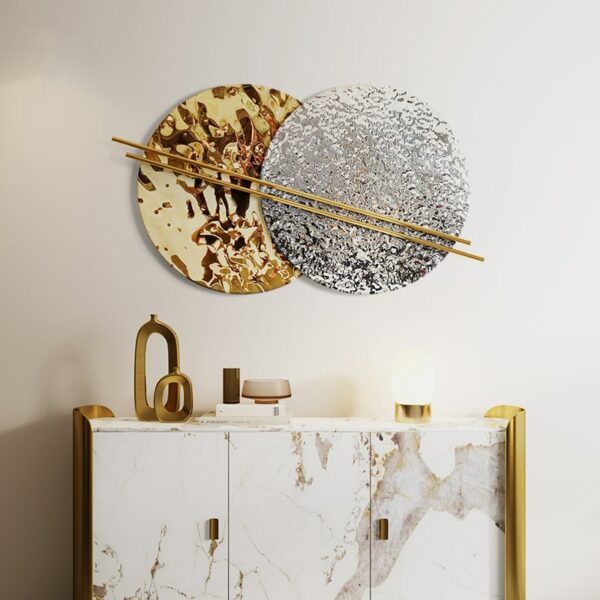 Phù Điêu Nghệ Thuật Ánh Sáng Đối Lập là tác phẩm trang trí đầy sáng tạo, kết hợp hài hòa giữa hai vòng tròn kim loại bóng loáng với bề mặt khác biệt về màu sắc và chất liệu. Màu vàng kim loại và bạc tạo nên sự tương phản bắt mắt, trong khi hai thanh kim loại ngang thanh lịch tạo điểm nhấn tinh tế. Thiết kế hiện đại này thích hợp để làm điểm nhấn nghệ thuật cho phòng khách hoặc phòng làm việc, góp phần tăng thêm vẻ sang trọng và phong cách độc đáo cho không gian sống.