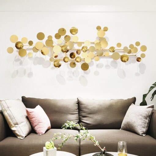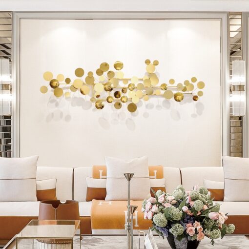 Phù điêu treo tường chùm bóng kim loại mang lại sự thanh thoát, nhẹ nhàng nhưng đầy ấn tượng. Các bóng kim loại được tạo hình từ những hình tròn, được sắp xếp khéo léo, tạo sự hài hòa và cân đối cho không gian. Màu sắc vàng kim của tranh làm nổi bật không gian phòng khách mà không gây cảm giác lòe loẹt hay làm cho không gian trở nên quá chói mắt. Điều này rất quan trọng khi lựa chọn phù điêu treo tường kim loại cho phòng khách hoặc các không gian sống cần sự sang trọng nhưng không kém phần thanh lịch.