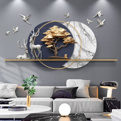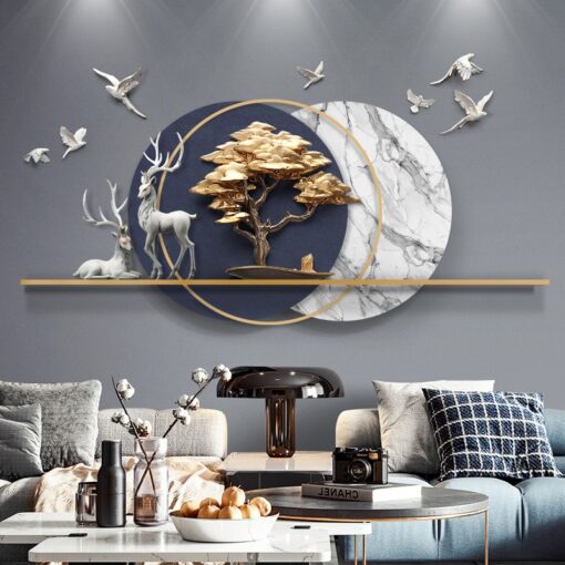 Phù Điêu Treo Tường Đôi Hươu là tác phẩm nghệ thuật trang trí tinh tế, kết hợp hài hòa giữa hình ảnh đôi hươu thanh lịch và yếu tố tự nhiên như cây cối, chim chóc. Thiết kế sử dụng màu sắc sang trọng như vàng kim và xanh đậm, tạo điểm nhấn nổi bật trên nền tường xám hiện đại. Sản phẩm không chỉ làm đẹp không gian phòng khách mà còn mang ý nghĩa phong thủy về sự may mắn, bình an và thịnh vượng cho gia đình. Đây là lựa chọn lý tưởng cho không gian nội thất đẳng cấp, tinh tế.