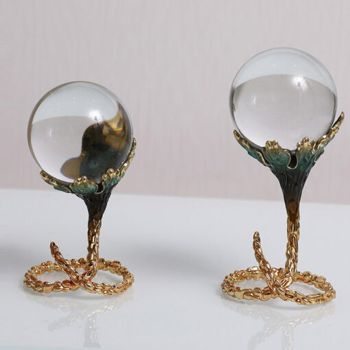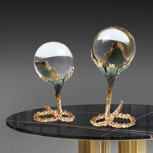 Quả cầu pha lê trong suốt được đặt trên đế dây leo uốn lượn, tạo nên một tổng thể hoàn hảo giữa sự mềm mại và mạnh mẽ. Đế dây leo được chế tác từ chất liệu kim loại cao cấp với màu sắc vàng ánh kim, tạo sự tương phản nổi bật với quả cầu pha lê trong suốt, mang lại vẻ đẹp đầy cuốn hút và tinh tế.