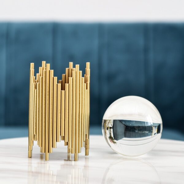 Quả cầu pha lê được chế tác với độ trong suốt hoàn hảo, mang đến cảm giác như cả không gian được mở rộng và trở nên sáng hơn. Phần đế vàng rực rỡ với các thanh vàng hình trụ tạo cảm giác mạnh mẽ nhưng vẫn giữ được sự mềm mại nhờ cách sắp xếp hài hòa. Chính sự kết hợp này đã giúp sản phẩm trở thành biểu tượng của sự tinh tế và sang trọng trong mọi không gian sống.