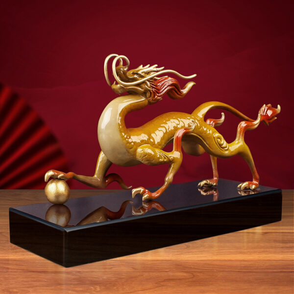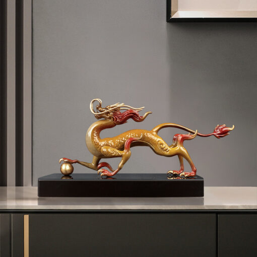 Từng chi tiết trên tượng Rồng Kim Cầu Chiêu Tài được chế tác tỉ mỉ bởi các nghệ nhân hàng đầu, kết hợp hài hòa giữa rồng uy nghiêm và quả cầu kim cương lấp lánh. Thiết kế thể hiện sự linh hoạt, cân đối, mang nét đẹp độc đáo, phù hợp với nhiều không gian khác nhau từ phòng khách, văn phòng đến phòng làm việc.