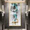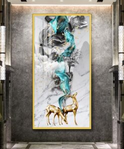 Tranh Đôi Hươu Treo Tường Khổ Dọc là tác phẩm nghệ thuật kết hợp hài hòa giữa vẻ đẹp thiên nhiên và sự tinh tế hiện đại. Hình ảnh đôi hươu dát vàng thanh thoát, uyển chuyển nổi bật trên nền tranh với những đường sóng mềm mại màu xanh lam và xám, tạo cảm giác yên bình, sang trọng cho không gian. Bố cục khổ dọc giúp tôn lên chiều cao và sự thanh thoát, phù hợp trang trí hành lang, phòng khách hoặc không gian sống cần điểm nhấn nghệ thuật đầy phong cách và ý nghĩa phong thủy.