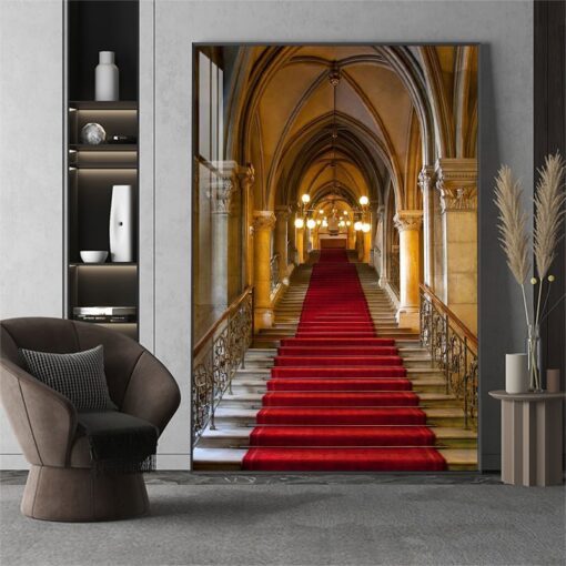 Phong cách châu Âu trong nghệ thuật luôn mang lại sự sang trọng và tinh tế, từ những lâu đài cổ điển đến các công trình kiến trúc hiện đại. Tranh phong cách châu Âu cũng không ngoại lệ, mang lại vẻ đẹp thanh lịch và cuốn hút. Những bức tranh với hình ảnh cầu thang đỏ trong lâu đài cổ là sự kết hợp hoàn hảo giữa nghệ thuật kiến trúc và hội họa, mang đến một tác phẩm nghệ thuật sống động và đầy cuốn hút.