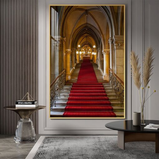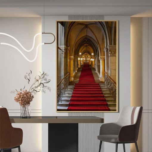 Phòng khách là không gian quan trọng nhất trong ngôi nhà, nơi gia chủ tiếp đón khách và thể hiện gu thẩm mỹ cá nhân. Tranh trang trí phòng khách phong cách châu Âu với hình ảnh cầu thang đỏ trong lâu đài cổ sẽ là một điểm nhấn hoàn hảo, làm nổi bật không gian phòng khách và tạo sự thu hút mạnh mẽ.