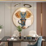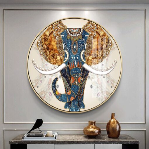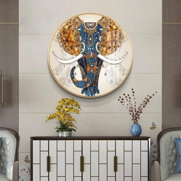 Tranh Voi Treo Tường Phòng Khách sở hữu thiết kế hình tròn, với hình ảnh chú voi mạnh mẽ nhưng đầy uyển chuyển. Các chi tiết trên bức tranh được khắc họa rất tỉ mỉ, đặc biệt là các họa tiết trang trí đẹp mắt trên cơ thể voi, tạo ra một không gian nghệ thuật ấn tượng. Màu sắc chủ đạo của bức tranh là vàng, xanh và trắng, mang lại sự hài hòa nhưng cũng rất nổi bật.