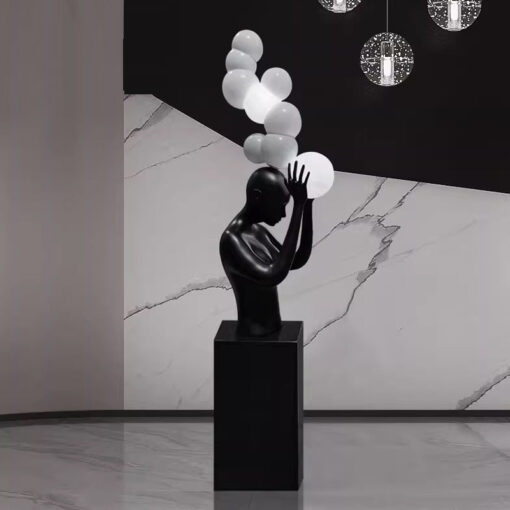 Màu sắc chủ đạo của tượng là đen và trắng, tạo nên sự tương phản độc đáo và phong cách tối giản hiện đại. Màu đen tạo cảm giác mạnh mẽ và sang trọng, trong khi màu trắng của các quả cầu lơ lửng lại mang đến sự tươi mới, trong trẻo. Đây là sự kết hợp màu sắc hoàn hảo cho không gian sống hiện đại, làm nổi bật tính thẩm mỹ của tượng.
