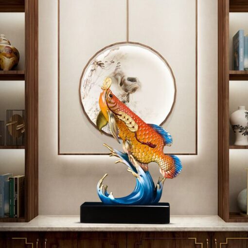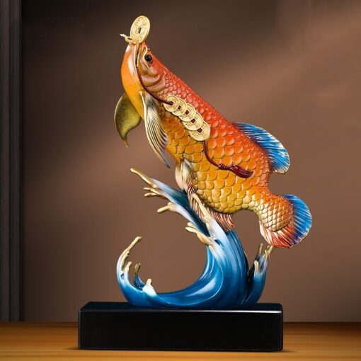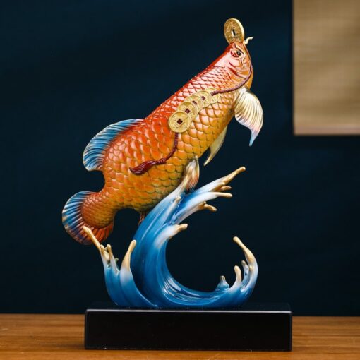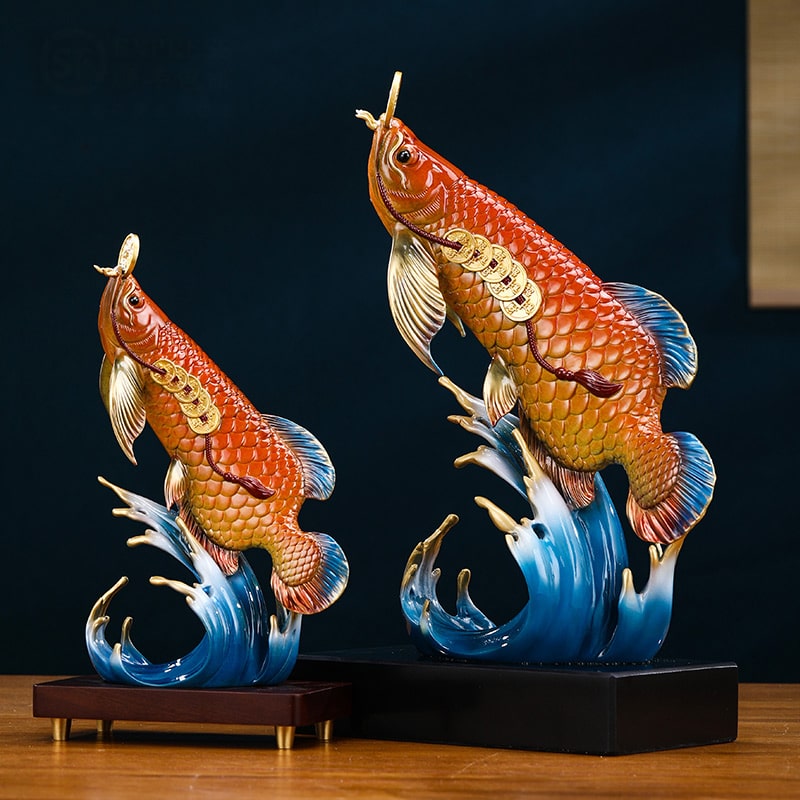 Tượng Cá Rồng Tấn Tài Tấn Lộc mang dáng vươn mình khỏe khoắn, thể hiện sức sống mãnh liệt và ý chí vươn lên. Những đường nét chế tác tinh xảo, vảy rồng uốn lượn hài hòa, kết hợp họa tiết đồng tiền ngân lượng tạo nên vẻ sang trọng và đẳng cấp. Biểu tượng long ngư đem lại thịnh vượng, tài lộc dồi dào, truyền cảm hứng quyết tâm, may mắn và thành công cho gia chủ.