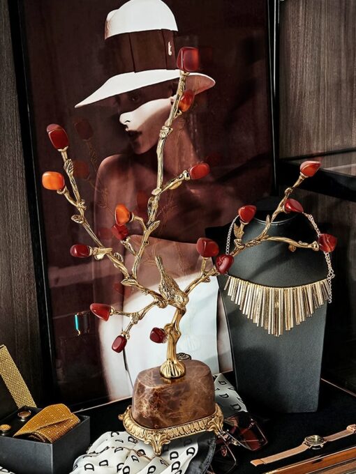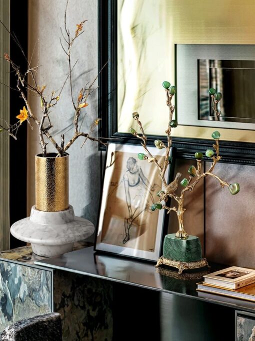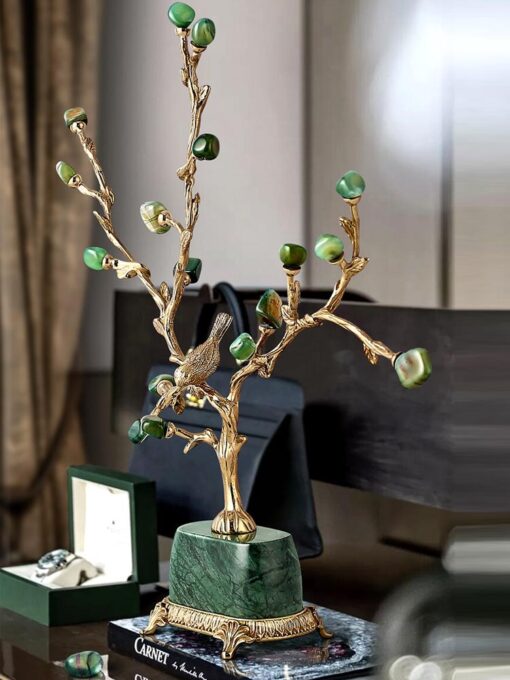 Tượng cây quý bảo được chế tác từ các chất liệu cao cấp như đồng, đá mã não, spar và đá cẩm thạch tạo nên vẻ ngoài lấp lánh, cuốn hút. Các nhánh cây được uốn lượn mềm mại, mô phỏng hình dáng cây thật nhưng lại mang đậm phong cách hiện đại và nghệ thuật. Những viên đá quý được gắn khéo léo trên mỗi nhánh cây, phản chiếu ánh sáng, tạo nên vẻ đẹp lấp lánh đầy quyến rũ.