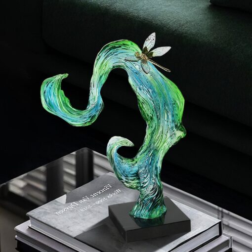 Tượng được thiết kế theo phong cách trừu tượng với các đường nét uốn lượn mềm mại, tạo cảm giác dòng nước chảy. Chuồn chuồn nhỏ bé đậu trên dòng xanh làm điểm nhấn, gợi lên sự tinh tế và phá cách trong thiết kế. Đây là món đồ trang trí phù hợp với những không gian hiện đại, nơi cần một tác phẩm nghệ thuật làm trung tâm.