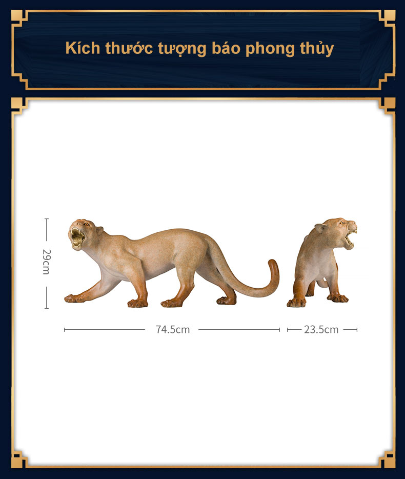 Báo là loài vật đại diện cho sức mạnh vượt trội, sự nhanh nhẹn và khả năng săn mồi tinh vi. Trong phong thủy, tượng con báo biểu thị cho sức mạnh dũng mãnh, sự quyết đoán và khả năng vượt qua thử thách một cách ngoạn mục. Hình ảnh báo gầm vang, uy nghiêm giúp gia chủ khẳng định vị thế và thu hút năng lượng tích cực, đẩy lùi vận xui, xua tan tà khí.