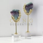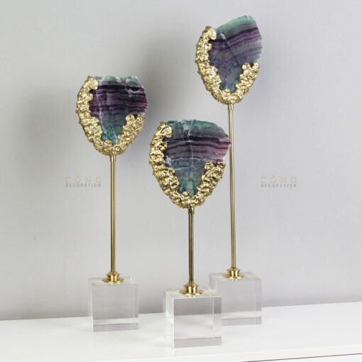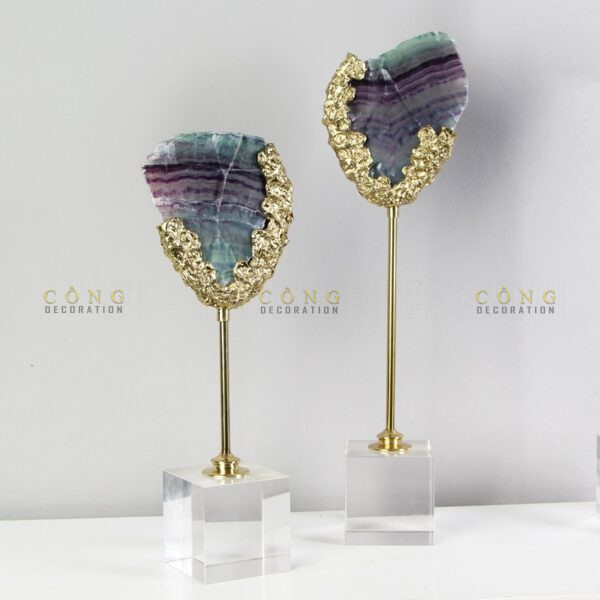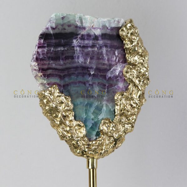 Lớp vàng phủ ngoài là điểm nhấn hoàn hảo, kết hợp với đế pha lê trong suốt mang lại sự cân bằng giữa sự mạnh mẽ của đá và sự thanh thoát của pha lê. Điều này giúp sản phẩm vừa mang nét hiện đại vừa giữ được sự mộc mạc, gần gũi với thiên nhiên.