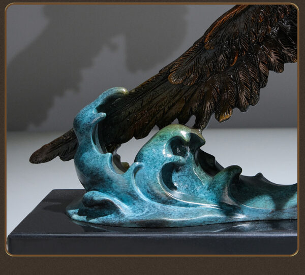 Biển khơi trong phong thủy đại diện cho những thử thách và cơ hội, một vùng không gian rộng lớn và không thể kiểm soát hoàn toàn. Khi đại bàng tung cánh giữa biển khơi, nó không chỉ thể hiện sự can đảm mà còn tượng trưng cho khả năng làm chủ bản thân trước những tình huống khó khăn. Đặt tượng đại bàng trong nhà hoặc nơi làm việc giúp gia chủ mở rộng tầm nhìn, khơi dậy khát vọng lớn lao và không ngừng vươn lên.