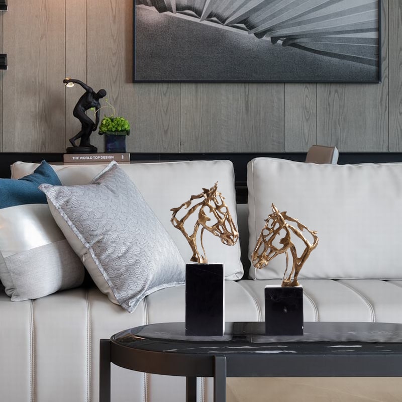 - Phòng khách: Đây là không gian lý tưởng để đặt tượng đầu ngựa, giúp tạo điểm nhấn nổi bật và thu hút sự chú ý ngay từ khi bước vào phòng. Bạn có thể đặt tượng trên bàn trà, kệ tivi, hoặc kệ sách để làm đẹp cho không gian sống.