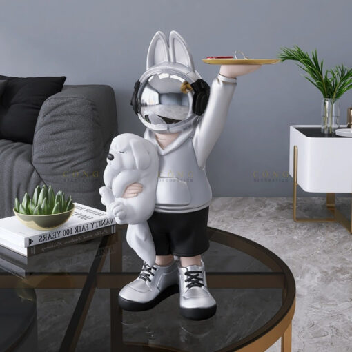 Tượng được thiết kế với hình dáng cậu bé đội mũ tai thỏ, bưng khay tiện dụng và ôm chú chó đáng yêu. Sự kết hợp giữa phong cách trẻ trung, chất liệu cao cấp và sự khéo léo trong từng đường nét đã biến sản phẩm này trở thành món đồ trang trí không thể thiếu trong các không gian sống hiện đại.