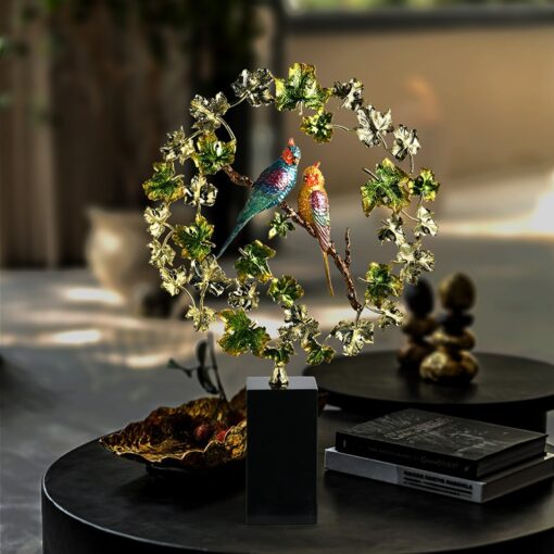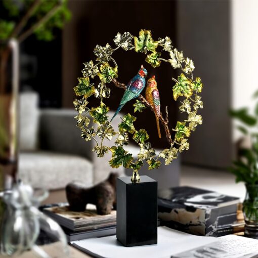 Tác phẩm thường được chế tác từ những chất liệu cao cấp như đồng, pha lê, hợp kim mạ vàng, hoặc đá quý, mang đến vẻ đẹp sang trọng và sự tinh tế. Bên cạnh đó, tượng đôi chim uyên ương thường được thiết kế với những họa tiết hoa lá, cành cây hoặc vòng nguyệt quế, tạo nên một tổng thể hài hòa và ý nghĩa.
