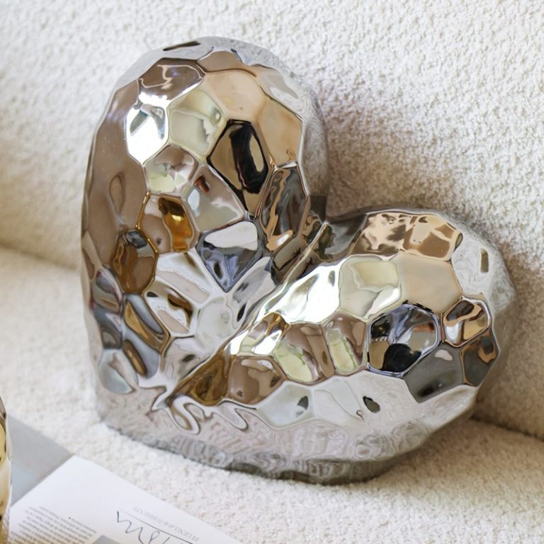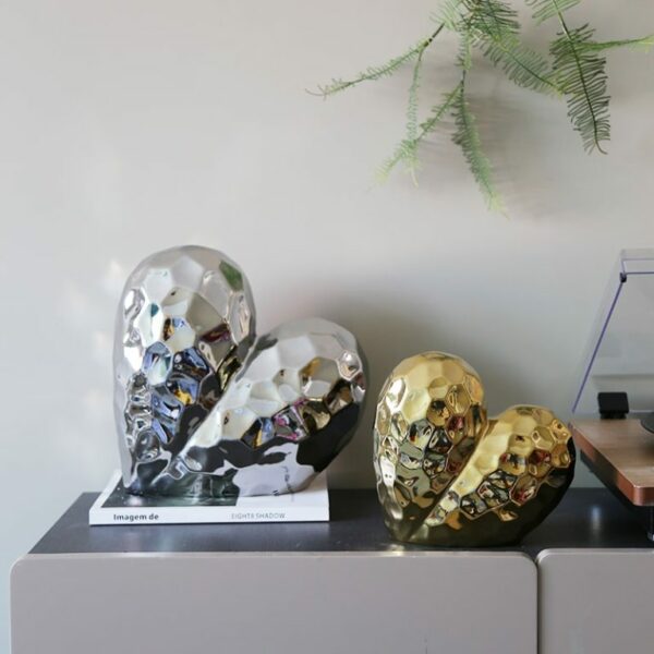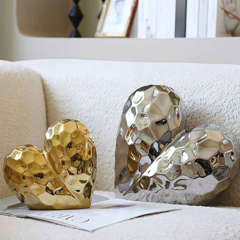 Tượng Đôi Tim Tình Yêu Nghệ Thuật là biểu tượng tinh tế của sự gắn kết và cảm xúc sâu sắc. Với thiết kế hiện đại, bề mặt lồi lõm độc đáo cùng chất liệu kim loại sáng bóng, bộ tượng tạo nên sức hút thị giác mạnh mẽ và cảm giác sống động. Màu sắc vàng và bạc hài hòa mang lại sự sang trọng và ấm áp, rất phù hợp để trang trí phòng khách, phòng ngủ hoặc không gian lãng mạn. Đây là món đồ decor tuyệt vời để thể hiện tình yêu và sự đồng điệu trong không gian sống.
