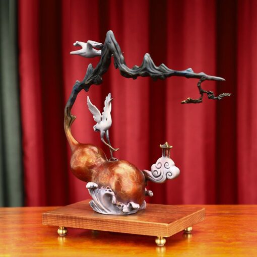 Tượng hạc được thiết kế với sự chăm chút tỉ mỉ trong từng chi tiết nhỏ nhất. Hình ảnh hạc đang nhẹ nhàng bước trên hồ lô, đôi cánh hơi vươn lên như chuẩn bị tung bay, thể hiện vẻ đẹp thanh thoát và đầy tự do. Đường nét mềm mại trên thân hạc, kết hợp cùng chi tiết uốn lượn tự nhiên của hồ lô, tạo nên một tác phẩm giàu tính thẩm mỹ.