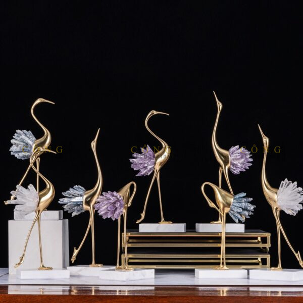 Những viên đá pha lê được gắn trên phần đuôi hạc, tạo ra vẻ đẹp lung linh và sang trọng. Sự kết hợp giữa đồng và đá pha lê không chỉ tạo nên giá trị thẩm mỹ cao mà còn gia tăng ý nghĩa phong thủy, giúp kích hoạt năng lượng tốt trong không gian sống.