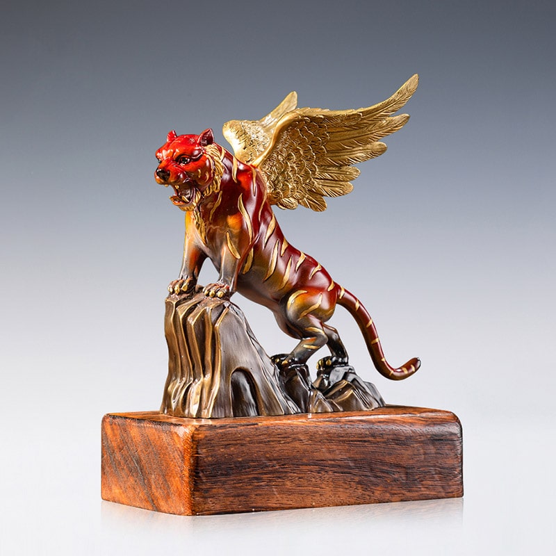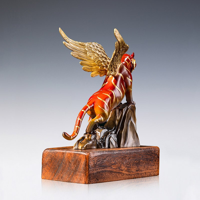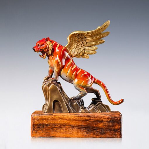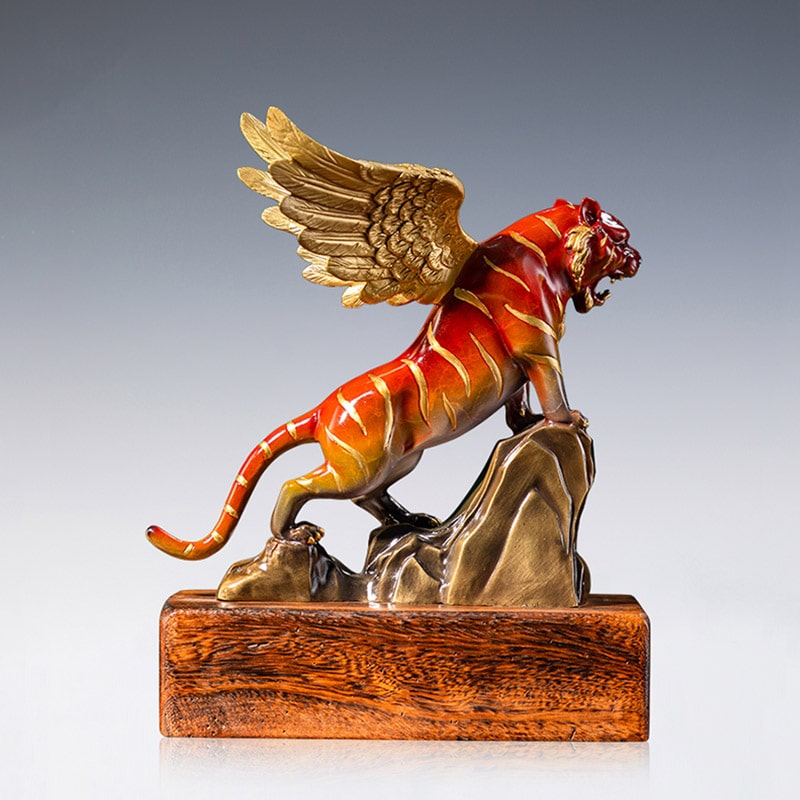 Tượng mô phỏng hình ảnh chú hổ vàng với dáng vẻ oai vệ đang vươn mình trên đỉnh núi cao. Đôi cánh vàng tượng trưng cho sự tự do, khả năng vượt mọi giới hạn, hướng tới đỉnh cao thành công trong sự nghiệp và cuộc sống. Màu vàng rực rỡ đại diện cho sự thịnh vượng, tài lộc, đồng thời cũng mang lại nguồn năng lượng tích cực mạnh mẽ.