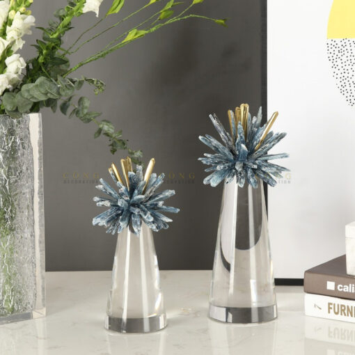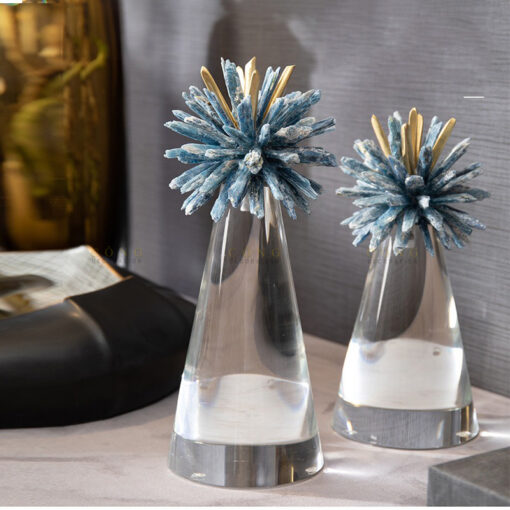 Phần đế của tượng được làm từ đá cẩm thạch và pha lê cao cấp, mang lại sự chắc chắn và đẳng cấp. Thiết kế tối giản với hình dáng cẩm tú cầu nở rộ thể hiện sự sống động, giúp tượng dễ dàng phù hợp với nhiều phong cách nội thất khác nhau, từ hiện đại đến cổ điển.