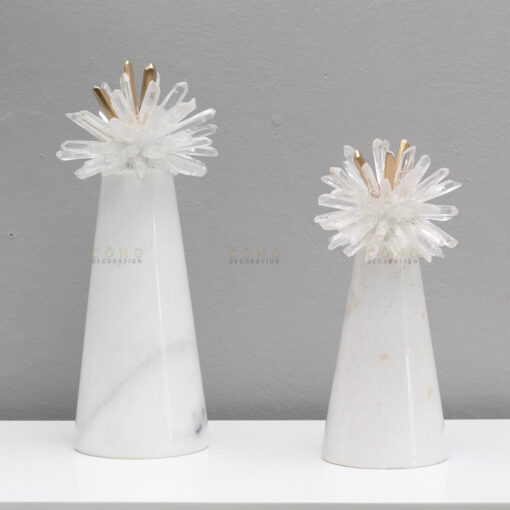 Thạch anh được biết đến là loại đá quý có khả năng thu hút và lưu giữ năng lượng tích cực. Khi kết hợp với hoa cẩm tú cầu – biểu tượng của sự thay đổi và tiến hóa, tượng mang đến sự cân bằng và hài hòa trong cuộc sống, giúp gia chủ gặp nhiều may mắn và thành công.