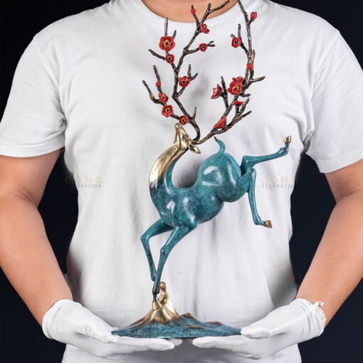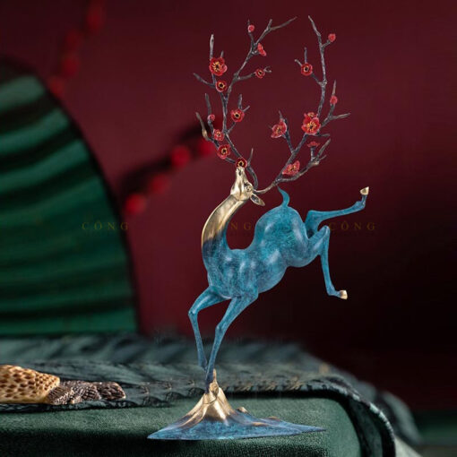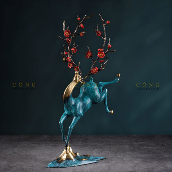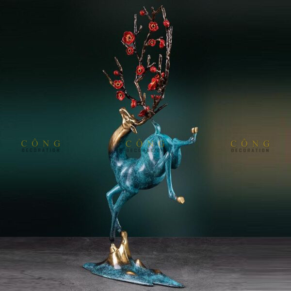 Tượng “Hươu Cành Đào Tài Lộc” là một tác phẩm nghệ thuật mang đậm phong cách truyền thống pha lẫn hiện đại, tượng trưng cho sự thịnh vượng, tài lộc và may mắn trong cuộc sống. Với dáng đứng độc đáo, một chân nâng cao thể hiện sự vươn lên mạnh mẽ, cành đào đỏ thắm như biểu tượng của mùa xuân và sự sinh sôi phát triển. Màu sắc xanh ngọc pha ánh vàng đồng hòa quyện, tạo nên vẻ đẹp sang trọng và đẳng cấp, rất thích hợp để trưng bày trong phòng khách, phòng làm việc hoặc làm quà tặng ý nghĩa, mang đến năng lượng tích cực cho không gian sống và làm việc của bạn.