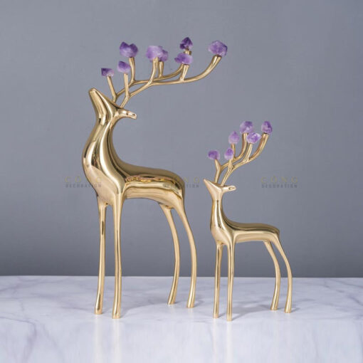 Cặp Hươu Vàng Phong Thủy Đính Đá Thạch Anh Tím trang trí kệ rượu