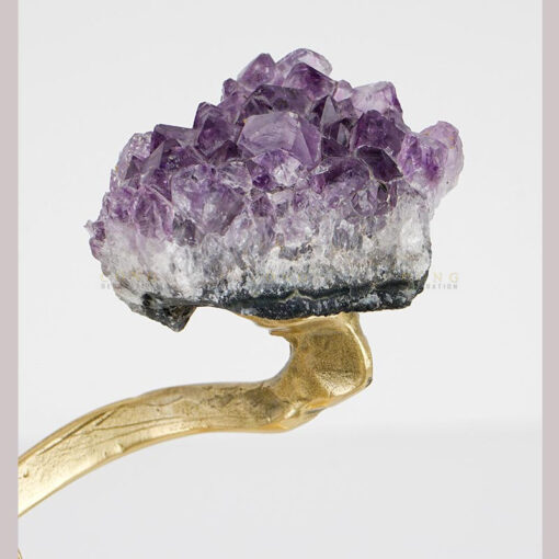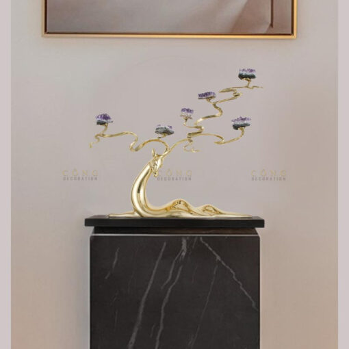 Tượng Hươu Vàng Nghệ Thuật Đính Thạch Anh là tác phẩm tinh tế kết hợp giữa nghệ thuật điêu khắc hiện đại và vẻ đẹp tự nhiên của đá thạch anh tím. Với thiết kế uốn lượn mềm mại, mang hình ảnh chú hươu thanh lịch, sang trọng, tượng không chỉ là vật trang trí đẹp mắt mà còn mang ý nghĩa phong thủy về sự may mắn, thịnh vượng và sức khỏe. Đế đá đen bóng tạo sự cân đối hoàn hảo, làm nổi bật từng chi tiết tinh xảo trên thân tượng. Đây là lựa chọn hoàn hảo cho không gian sống hoặc làm quà tặng ý nghĩa.