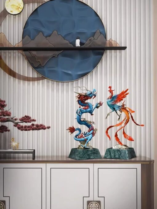 Tượng Phượng: Tượng phượng mang dáng vẻ uyển chuyển, cánh vươn rộng và bộ lông rực rỡ, thể hiện sự thịnh vượng và hòa hợp. Màu sắc tươi sáng của phượng không chỉ mang lại vẻ đẹp cho sản phẩm mà còn tượng trưng cho sự phát triển liên tục và hòa bình trong gia đình.