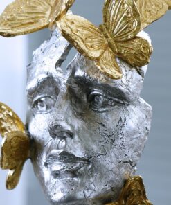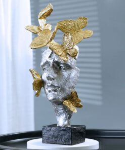 Tượng “Mặt Nạ Bướm Vàng Đẹp Mắt” là một tác phẩm nghệ thuật độc đáo, mang vẻ đẹp tinh tế và sang trọng. Với khuôn mặt được thiết kế cách điệu kết hợp cùng những cánh bướm màu vàng óng ánh bay lượn xung quanh, tượng thể hiện sự hòa quyện giữa sự mềm mại và mạnh mẽ, tạo nên điểm nhấn nghệ thuật đầy thu hút cho không gian nội thất. Sản phẩm thích hợp trang trí phòng khách, phòng làm việc hay kệ sách, mang lại cảm giác thanh lịch và phong cách hiện đại cho căn phòng. Đây chắc chắn là món đồ decor lý tưởng cho những ai yêu thích nghệ thuật và sự sáng tạo.