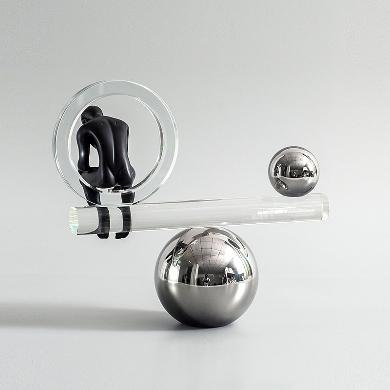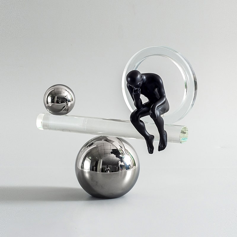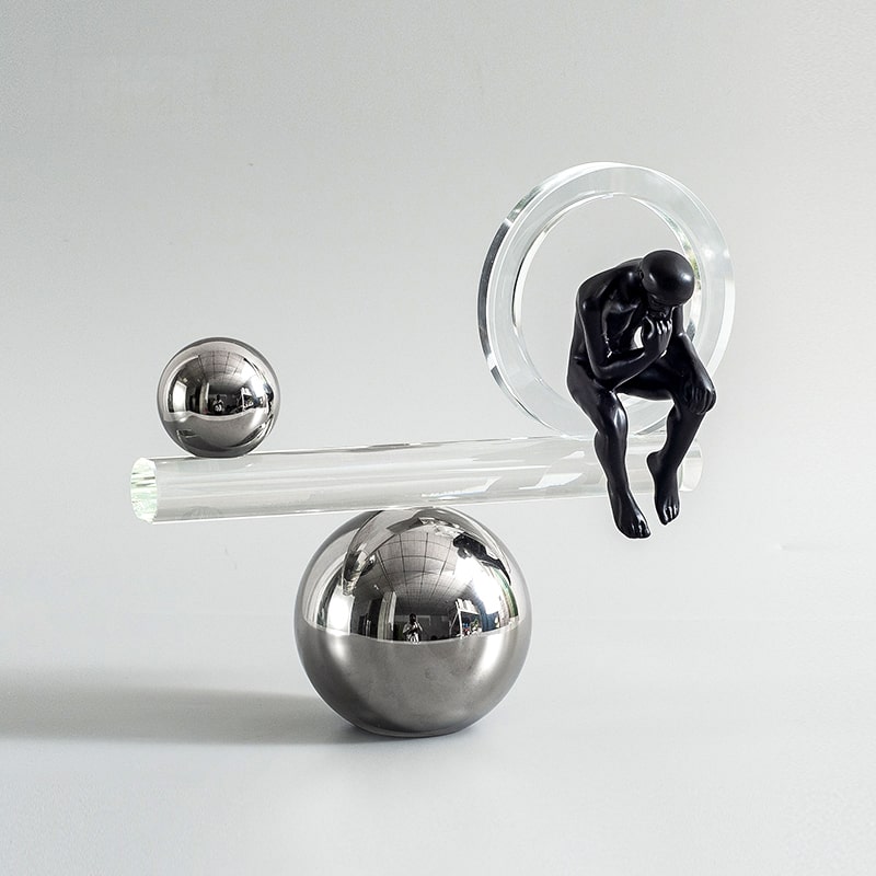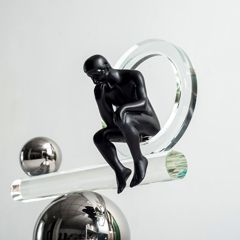 Tượng mô phỏng hình ảnh một nhân vật đang suy tư sâu sắc, ngồi trên thanh trụ cân bằng trên quả cầu lớn – biểu tượng của sự cân bằng và tư duy phản chiếu. Hình khối đơn giản nhưng giàu biểu cảm, giúp người xem dễ dàng liên tưởng và cảm nhận về sự tĩnh lặng, thăng hoa tinh thần.