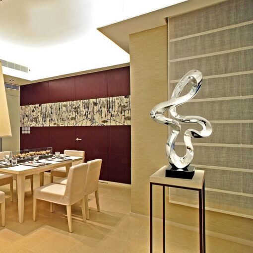Thiết kế trừu tượng với các đường cong liên tục thể hiện sự vận động không ngừng, biểu trưng cho sự phát triển và trường tồn. Tượng mang ý nghĩa phong thủy tốt, giúp kích hoạt năng lượng tích cực, mang lại may mắn và thịnh vượng cho gia chủ.