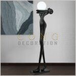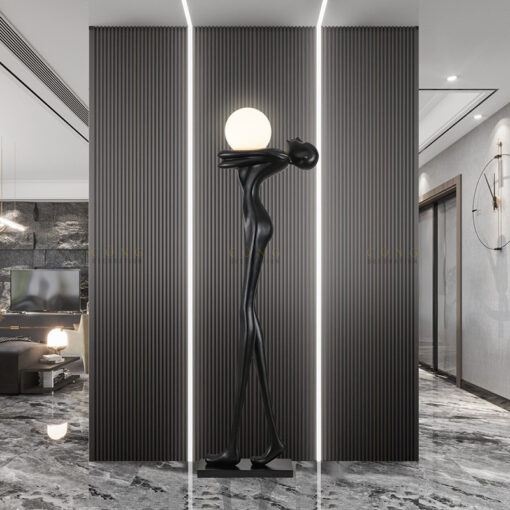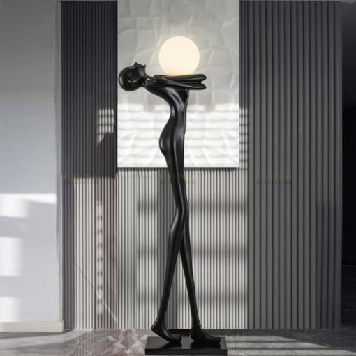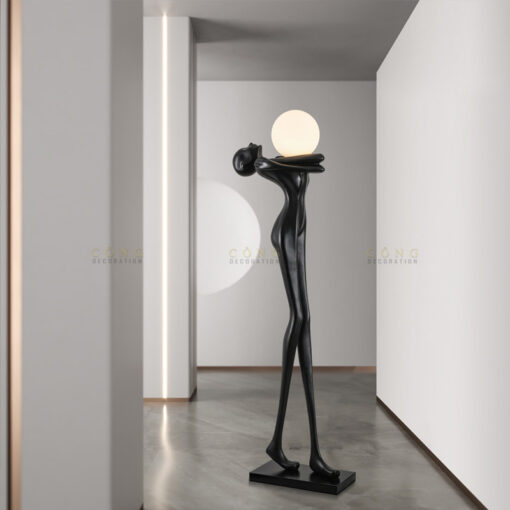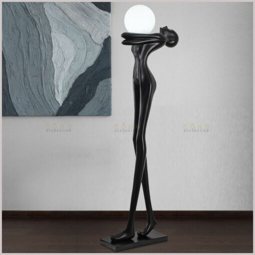 Toàn bộ tượng được phủ lớp sơn đen bóng, tạo sự tương phản mạnh mẽ với ánh sáng trắng của quả cầu. Sự phối hợp giữa hai gam màu tối giản này mang đến sự thanh lịch, hiện đại, phù hợp với nhiều phong cách nội thất.