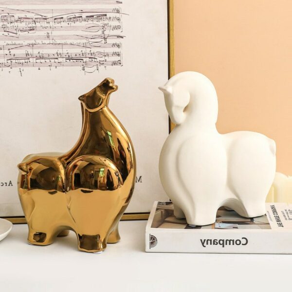 Gốm sứ là chất liệu phổ biến trong việc sản xuất các sản phẩm trang trí phong thủy. Với đặc tính cứng cáp, bền lâu và dễ dàng tạo hình, gốm sứ mang đến độ sắc nét và tinh tế cho từng chi tiết của tượng ngựa. Đồng thời, lớp mạ vàng được phủ lên tượng giúp gia tăng giá trị thẩm mỹ và mang lại sự sang trọng cho không gian sống. Gốm sứ còn được biết đến với khả năng chịu nhiệt, chống thấm nước và chống mài mòn rất tốt, giúp bảo vệ tượng ngựa khỏi tác động của môi trường.