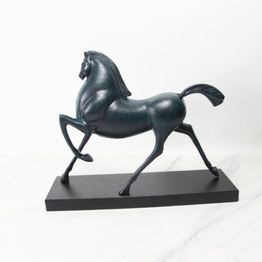 Phần thân ngựa được tạo hình mềm mại với các đường cong tự nhiên, chân ngựa dang bước mang đến cảm giác chuyển động và sức sống mãnh liệt. Bộ móng chắc chắn gắn trên đế phẳng giúp sản phẩm đứng vững, đảm bảo an toàn khi bày trí.