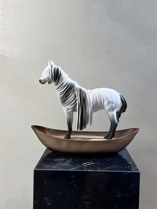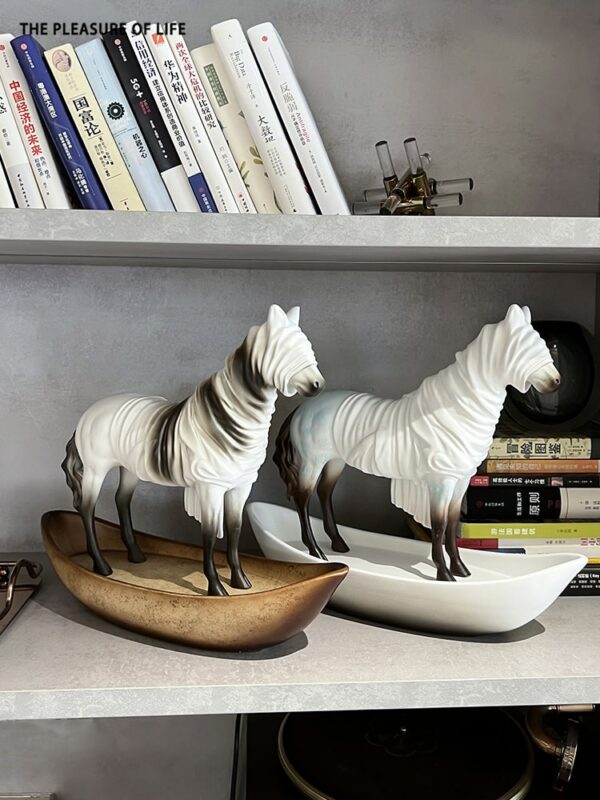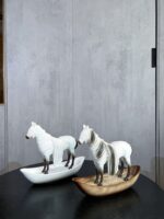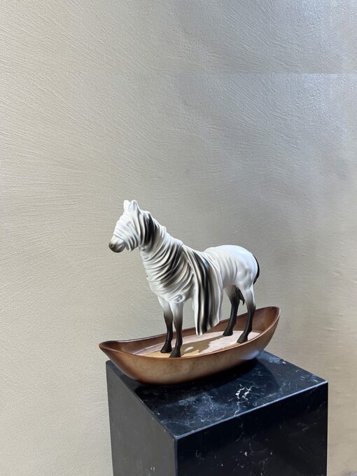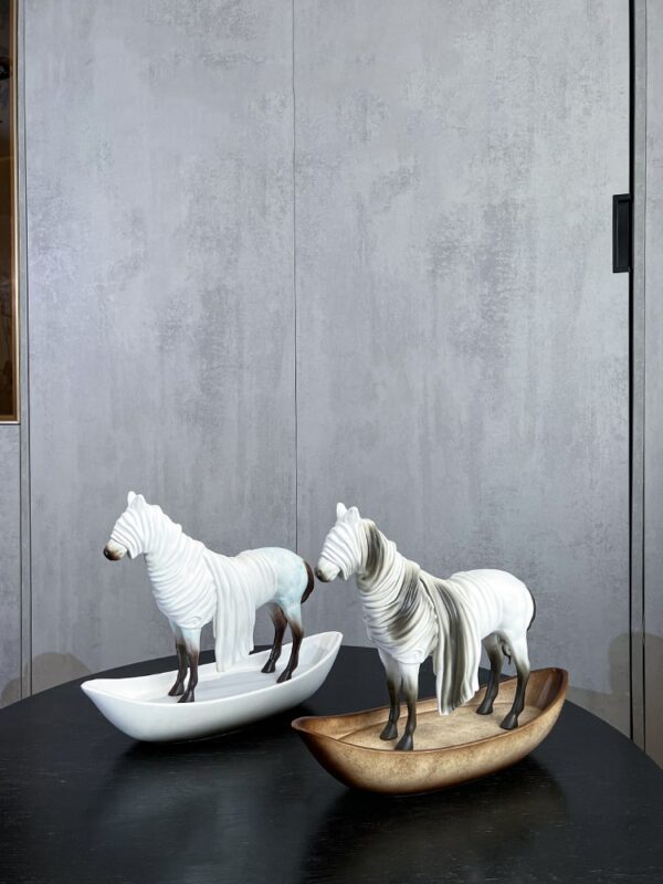 Tượng ngựa trắng trừu tượng được thiết kế với phong cách hiện đại và độc đáo. Chú ngựa mang những đường nét mềm mại nhưng vẫn toát lên sự mạnh mẽ. Phần thân được tạo hình trừu tượng, tạo nên sự phá cách trong nghệ thuật trang trí. Đặc biệt, chú ngựa được đặt trên một chiếc thuyền mạ đồng, mang đến cảm giác nhẹ nhàng và thanh thoát.