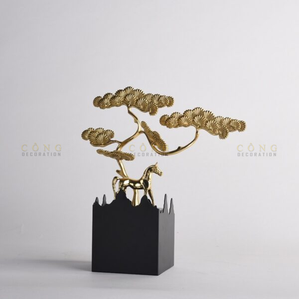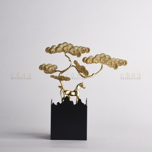 Trong văn hóa phương Đông, cây tùng luôn được coi là biểu tượng của sự bền bỉ, trường thọ. Cây tùng có khả năng sống lâu, phát triển mạnh mẽ và giữ được sức sống trong mọi điều kiện khắc nghiệt. Chính vì vậy, trong phong thủy, cây tùng mang ý nghĩa bảo vệ gia chủ khỏi những điều xui xẻo, đồng thời mang lại sự ổn định và thịnh vượng lâu dài. Đặc biệt, trong tượng Tượng Ngựa Vàng “Tùng Hòa Phát”, cây tùng được cách điệu với những nét thiết kế hiện đại nhưng vẫn giữ được vẻ đẹp truyền thống của cây tùng, tạo nên một sự kết hợp hài hòa giữa cái cũ và cái mới.