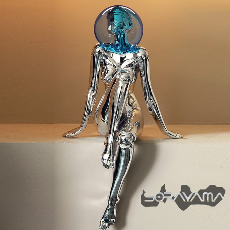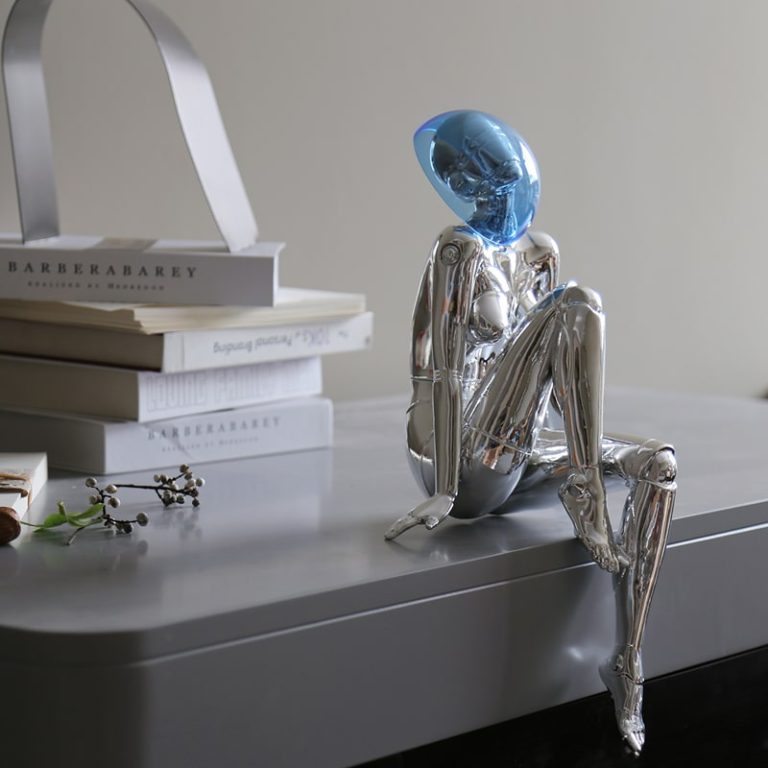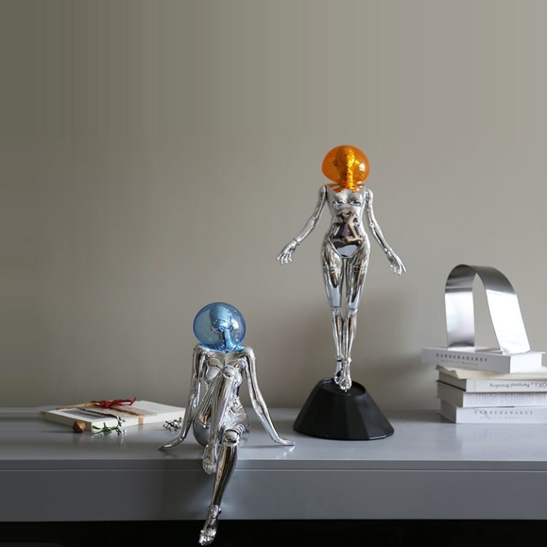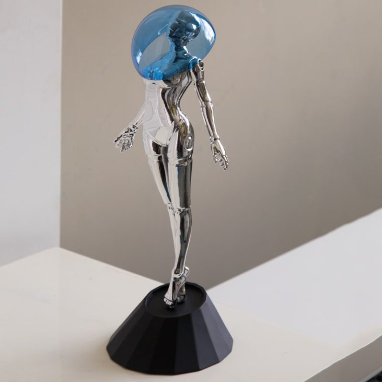 Tượng Nữ Thần Không Gian Huyền Bí mang vẻ đẹp hiện đại, đầy cuốn hút với thiết kế mạ bạc sáng bóng kết hợp cùng đầu tượng trong suốt màu sắc nổi bật tạo điểm nhấn độc đáo. Tác phẩm thể hiện sự kết nối giữa con người và vũ trụ, mang ý nghĩa khám phá và sáng tạo không ngừng. Với kiểu dáng tinh tế và chất liệu cao cấp, tượng rất thích hợp làm đồ decor trang trí phòng khách, văn phòng hoặc không gian nghệ thuật, góp phần nâng tầm không gian sống thêm phần sang trọng và huyền ảo.