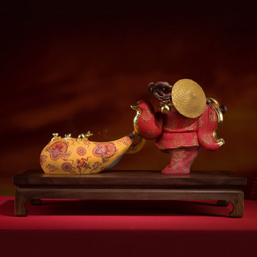 Tượng Phật Di Lặc Cát Tường được chế tác với sự tinh xảo trong từng chi tiết. Từ khuôn mặt tươi cười của Phật Di Lặc đến từng họa tiết trên y phục và chiếc túi, tất cả đều được thực hiện tỉ mỉ, tạo ra một tác phẩm nghệ thuật độc đáo. Màu sắc của tượng được phối hợp hài hòa, từ màu vàng sang trọng của lá vàng đến sắc đỏ và xanh tươi sáng của trang phục. Đây là món quà phong thủy tuyệt vời dành cho người thân, bạn bè hoặc đối tác, mang lại sự may mắn và bình an cho người nhận.