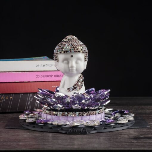 Tượng được chế tác từ chất liệu cao cấp với các chi tiết được gia công tỉ mỉ. Phần đế sen được trang trí bằng những viên đá sáng lấp lánh, phản chiếu ánh sáng tự nhiên tạo nên vẻ đẹp nổi bật. Đây là sự lựa chọn hoàn hảo để làm nổi bật nội thất ô tô và thể hiện gu thẩm mỹ tinh tế của chủ nhân.